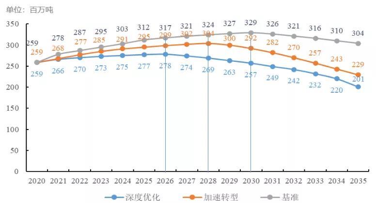 ◆加速情景:率先達(dá)峰,煤炭消費(fèi)占一次能源消費(fèi)比重、終端電氣化率按“十四五”規(guī)劃推進(jìn),并延伸至2035年;