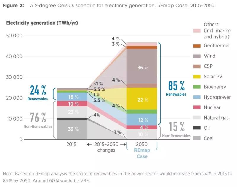 中國儲(chǔ)能網(wǎng)訊:按照國際可再生能源署(IRENA)發(fā)表的一份報(bào)告中,如果全球溫升控制在2攝氏度以內(nèi),要求2050年全球電力供應(yīng)的85%來自可再生能源,其中間歇性電源占58%(風(fēng)電36%、光伏22%),其余11%為化石能源、4%為核電。