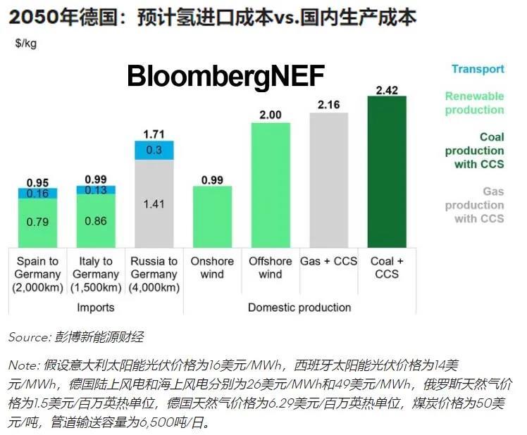 德國(guó)對(duì)氫氣管道的關(guān)注符合該國(guó)的氫戰(zhàn)略。為了實(shí)現(xiàn)氣候目標(biāo),該國(guó)2030年的低碳?xì)湫枨蟊仨氝_(dá)到90至110TWh,即230至280萬(wàn)噸。由于對(duì)本土可再生能源生產(chǎn)的擔(dān)憂較盛,德國(guó)氫戰(zhàn)略的實(shí)現(xiàn)將較大程度依賴氫氣進(jìn)口。在此背景下,通過(guò)管道將進(jìn)口氫氣輸送至各個(gè)需求點(diǎn),對(duì)德國(guó)氫戰(zhàn)略的成功實(shí)施至關(guān)重要。根據(jù)彭博新能源財(cái)經(jīng)的分析,管道也是長(zhǎng)距離、大規(guī)模氫氣運(yùn)輸?shù)淖盍畠r(jià)方式。比方說(shuō),到2050年,從意大利和西班牙進(jìn)口的氫氣將與德國(guó)國(guó)內(nèi)生產(chǎn)的綠色氫氣價(jià)格持平,甚至更低。
