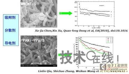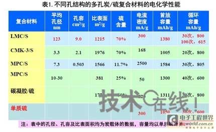 中國(guó)防化研究院的王維坤博士在9月16日于上海復(fù)旦大學(xué)舉行的“未來(lái)電動(dòng)汽車高能電源研討會(huì)”上表示,大介孔碳可通過(guò)充填單質(zhì)硫形成寄生型碳硫復(fù)合物。利用碳的高孔容(>1.5cm3/g),保證硫的高填充量,實(shí)現(xiàn)高容量;利用碳的高表面密度(>500cm2/g)吸附放電產(chǎn)物,提高循環(huán)穩(wěn)定性;利用碳的高導(dǎo)電性(幾S/cm)改善單質(zhì)硫的電絕緣性,提高硫的利用率和電池的充放電倍率性能。