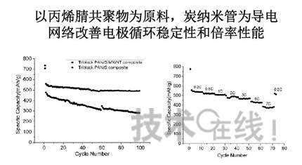 圖7 增加碳管含量,初始容量有所降低,但電極的循環(huán)穩(wěn)定性和倍率性能得到了提高