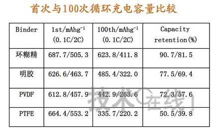 采用環(huán)糊精作電極粘合劑,因?yàn)槠錈o(wú)論在小電流還是大電流倍率下,都具有最好的循環(huán)性能。圖8和表3是幾種電極粘合劑對(duì)電池性能影響的比較。(記者恩平)
