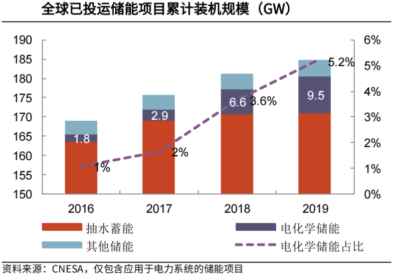 截至2020年底的數(shù)據(jù)顯示,全球已投運(yùn)儲(chǔ)能項(xiàng)目累計(jì)裝機(jī)規(guī)模 191.1GW。其中,抽水蓄能的累計(jì)裝機(jī)規(guī)模為 172.5GW,電化學(xué)儲(chǔ)能為14.2GW。電化學(xué)儲(chǔ)能占比相較此前有所擴(kuò)大,但占整體比重仍沒(méi)有超過(guò)10%。