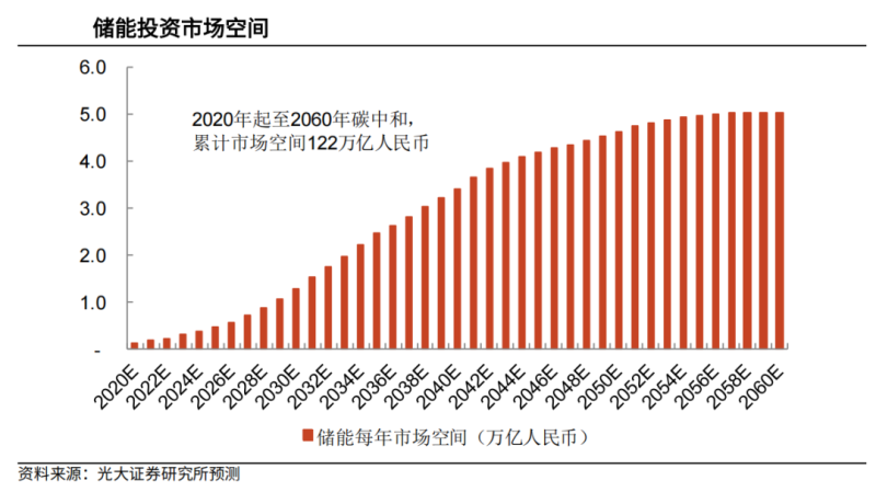 《每日經(jīng)濟(jì)新聞》記者注意到,目前市場(chǎng)普遍對(duì)儲(chǔ)能發(fā)展的前景相當(dāng)看好。光大證券測(cè)算稱,2030年儲(chǔ)能需求空間可達(dá)到1.25Twh(億千瓦時(shí)),2020年-2030年累計(jì)3.9TWh.2030年儲(chǔ)能市場(chǎng)空間有望達(dá)到1.3萬(wàn)億元,到2060年有望達(dá)到5萬(wàn)億元。