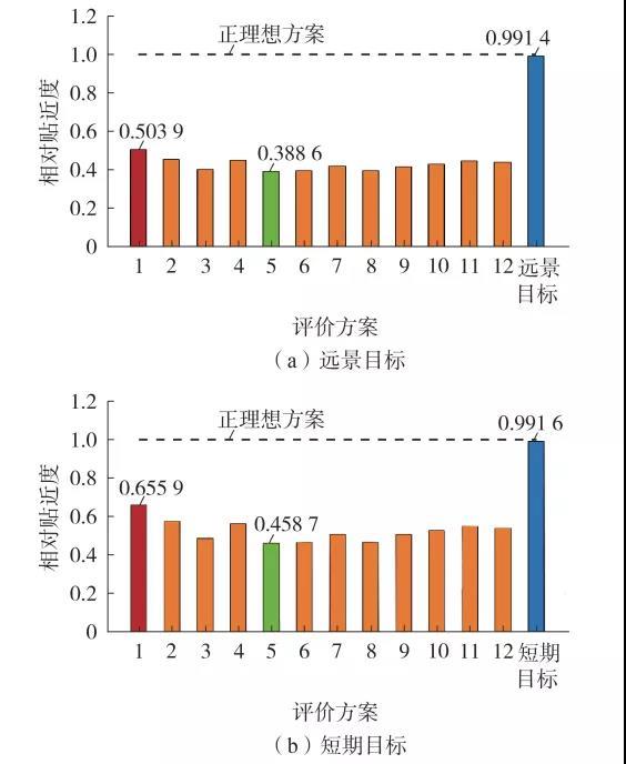 然后,采用基于FAHP與ITOPSIS的決策分析方法對算例進行綜合評價。本文參照“雙碳”目標(biāo),假設(shè)青海省共享儲能的發(fā)展存在遠景目標(biāo)與短期目標(biāo)。遠景目標(biāo)與短期目標(biāo)下評價方案的相對貼近度如圖3所示。