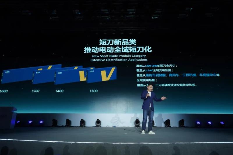 全域短刀化將涵蓋從L300-L600的全尺寸短刀電池產(chǎn)品,覆蓋從1.6-4C全域充電范圍,覆蓋從乘用車到儲(chǔ)能、商用車、工程機(jī)械、非高速電車等全域使用場景,覆蓋從無鈷、三元到磷酸鐵鋰全域化學(xué)體系。