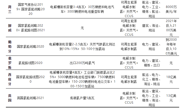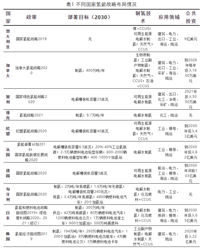 迄今公布的氫能戰(zhàn)略顯示,幾乎所有國家對氫能在其能源系統(tǒng)中所扮演角色的認識大致相同,都強調(diào)了其對交通運輸和工業(yè)部門脫碳的重要性。具體國家氫能戰(zhàn)略布局如表1所示: