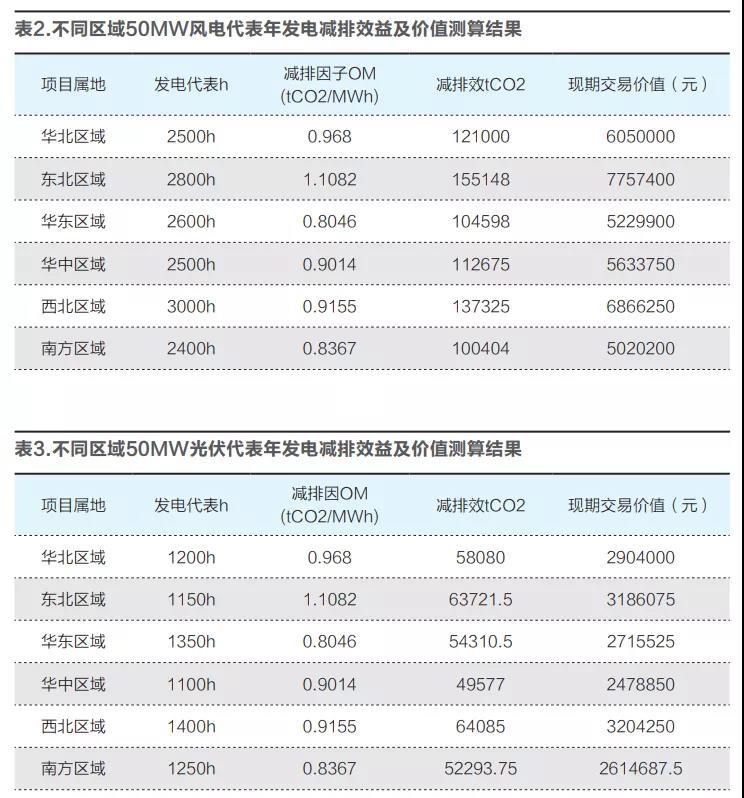 以電場(chǎng)發(fā)電量為基數(shù),取電量邊際排放因子的加權(quán)平均值0M計(jì)算,以下是不同區(qū)域50MW的風(fēng)電項(xiàng)目的代表年份發(fā)電情況的減排效益測(cè)算,按照目前市場(chǎng)價(jià)碳排放配額合計(jì)每噸約為50元。