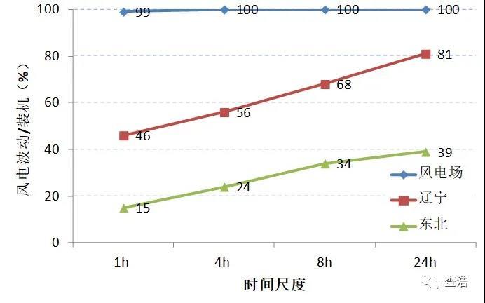 通過上圖可見,單座風(fēng)電場(chǎng)在一天中的不同時(shí)間尺度,波動(dòng)會(huì)很大,1小時(shí)內(nèi)出力會(huì)從0到滿發(fā),但一省所有風(fēng)電出力波動(dòng)性會(huì)相應(yīng)減小,多省風(fēng)電出力疊加后的整體波動(dòng)會(huì)進(jìn)一步降低。