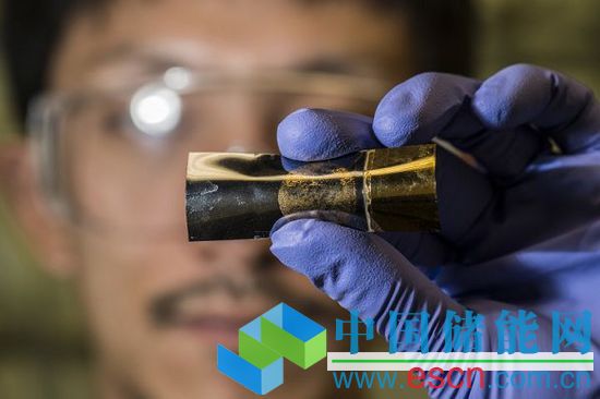 Yang Yang在展示一片柔性儲能原型,其結(jié)合了電池和超級電容的雙重優(yōu)良特性。