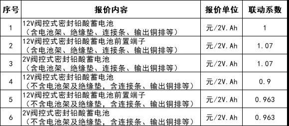基準(zhǔn)型號產(chǎn)品“12V閥控式密封鉛酸蓄電池(含電池架、絕緣墊、連接條、輸出銅排等)”最高投標(biāo)限價為0.885元人民幣/2V.Ah(不含稅), 非基準(zhǔn)型號產(chǎn)品單價根據(jù)基準(zhǔn)型號產(chǎn)品單價乘以價格聯(lián)動系數(shù)后保留3位小數(shù)計(jì)算得出,價格聯(lián)動系數(shù)見下表: