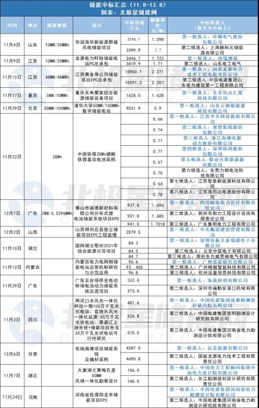 中國(guó)儲(chǔ)能網(wǎng)訊:11月初至今共有15個(gè)儲(chǔ)能相關(guān)項(xiàng)目發(fā)布候選人公示,其中有7個(gè)項(xiàng)目是儲(chǔ)能電池和儲(chǔ)能系統(tǒng)招標(biāo),儲(chǔ)能電池最高單價(jià)0.9元/Wh,儲(chǔ)能EPC最高單價(jià)2.271元/Wh,最低單價(jià)1.598元/Wh。