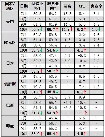 全球經(jīng)濟(jì)復(fù)蘇進(jìn)程放緩,發(fā)達(dá)經(jīng)濟(jì)體和新興市場經(jīng)濟(jì)體的通脹水平普遍上升。10月份,全球制造業(yè)PMI為54.3%,環(huán)比上升0.2個百分點。美國經(jīng)濟(jì)持續(xù)復(fù)蘇,制造業(yè)PMI和服務(wù)業(yè)PMI高位運(yùn)行,消費(fèi)活動比較活躍,失業(yè)率持續(xù)下降。歐元區(qū)經(jīng)濟(jì)修復(fù)動力有所弱化,制造業(yè)PMI和服務(wù)業(yè)PMI同時下降,受能源價格高漲影響,歐元區(qū)通脹率達(dá)到近20年內(nèi)最高值。日本經(jīng)濟(jì)逐漸回暖,服務(wù)業(yè)PMI回升至景氣區(qū)間。但仍低于之前水平,全球供應(yīng)鏈恢復(fù)仍需時間,影響全球通脹水平。德爾塔毒株影響下,歐美疫情再度嚴(yán)峻,東南亞的越南疫情有加速蔓延,全球經(jīng)濟(jì)修復(fù)進(jìn)程受到干擾,通脹壓力尚未出現(xiàn)觸頂跡象。