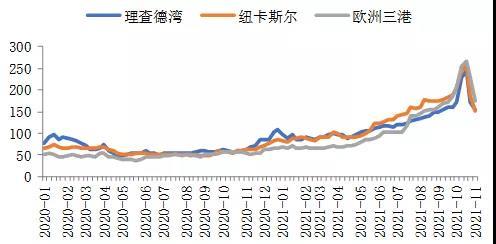 國際市場需求整體疲軟,國際動力煤價格以降為主。紐卡斯?fàn)?、理查德灣、歐洲三港動力煤價格指數(shù)分別于10月29日、10月15日、10月15日達(dá)峰后下降。截止11月12日,澳大利亞紐卡斯?fàn)柛蹌恿γ簝r格指數(shù)為156.28美元/噸,較11月5日上漲3.5美元/噸,漲幅為2.29%;理查德灣動力煤價格指數(shù)為135.46美元/噸,較11月5日下降20.12美元/噸,降幅為12.93%;歐洲ARA三港市場動力煤價格指數(shù)為141.7美元/噸,較11月5日下降33美元/噸,降幅為18.89%。