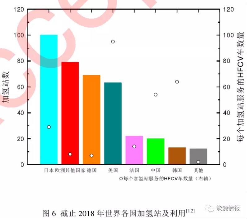圖6是截止2018年世界各國加氫站的建設(shè)情況。日本、德國和美國加氫站的建設(shè)比較早,也比較多,中國起步較晚,相對較少。2019年以后,中國加氫站數(shù)量爆發(fā)式增長,按照前瞻產(chǎn)業(yè)研究院的統(tǒng)計,2020年已達到88座。中石化計劃“十四五”期間建設(shè)1000座加氫站。不同國家的氫燃料加油站與輕型燃料電池電動汽車的比率差異很大,反映了部署方法、加油站規(guī)模、儲存壓力和利用率的差異。我國每個加氫站的平均氫能源車數(shù)量相對較高,說明我國更側(cè)重氫能源車的開發(fā)。
