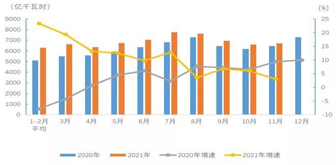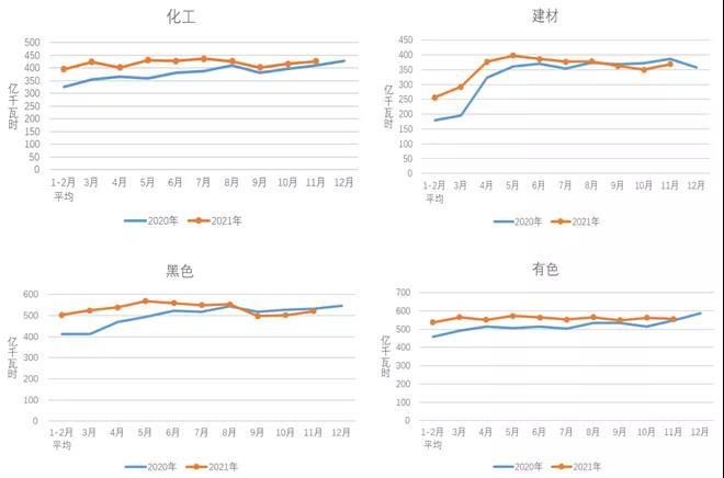 1-11月,化工行業(yè)用電量4582億千瓦時,同比增長7.4%,增速比上年同期提高6.1個百分點;建材行業(yè)用電量3804億千瓦時,同比增長8.3%,增速比上年同期提高4.8個百分點;黑色金屬冶煉行業(yè)用電量5824億千瓦時,同比增長7.7%,增速比上年同期提高4.2個百分點;有色金屬冶煉行業(yè)用電量6113億千瓦時,同比增長6.4%,增速比上年同期提高2.1個百分點。
