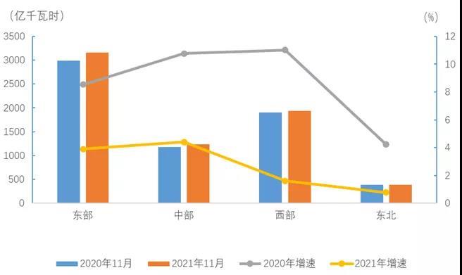 11月份,東、中、西部和東北地區(qū)全社會用電量增速分別為3.9%、4.4%、1.6%和0.8%。
