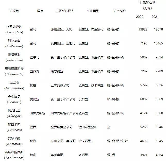 名列第一的是位于世界最大銅生產(chǎn)國(guó)智利的埃斯康迪達(dá)(Escondida)銅礦山。該礦由必和必拓公司(占57.5%股份)經(jīng)營(yíng),每天可開采礦石36萬(wàn)噸。根據(jù)前三季度產(chǎn)量,估計(jì)埃斯康迪達(dá)銅礦2021年可開采銅銀金礦石13078萬(wàn)噸。世界第二大礦業(yè)企業(yè)力拓公司持有該礦30%股份。