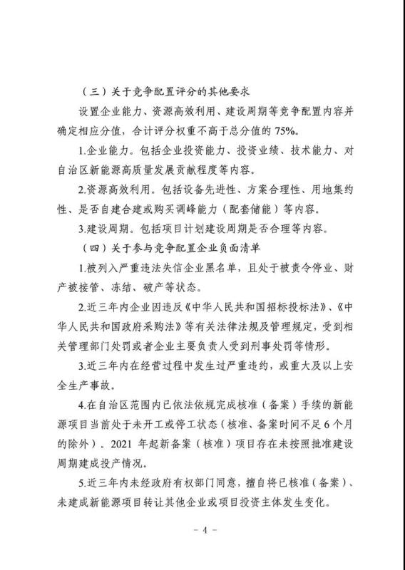 在《新疆維吾爾自治區(qū)2021年保障性并網(wǎng)新能源項(xiàng)目競(jìng)爭(zhēng)配置指導(dǎo)方案》中提出了五部分共17條要求,包括:減碳排貢獻(xiàn)度(能耗強(qiáng)度下降水平、實(shí)施碳強(qiáng)度下降及碳中和項(xiàng)目情況、增加碳匯量)、提質(zhì)增效(節(jié)能減排、綠色發(fā)展)、企業(yè)能力(企業(yè)投資能力、企業(yè)業(yè)績(jī)、企業(yè)技術(shù)能力、對(duì)新能源高質(zhì)量發(fā)展貢獻(xiàn)程度)、資源高效利用(設(shè)備先進(jìn)性、方案合理性、用地集約性)、建設(shè)周期(合理推進(jìn)項(xiàng)目建設(shè))。