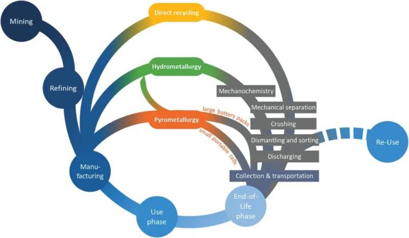 電池回收工藝可以減少資源需求以及對生態(tài)的破壞。目前,回收工藝可分為火法冶金和濕法冶金。圖7顯示了現(xiàn)有回收過程。