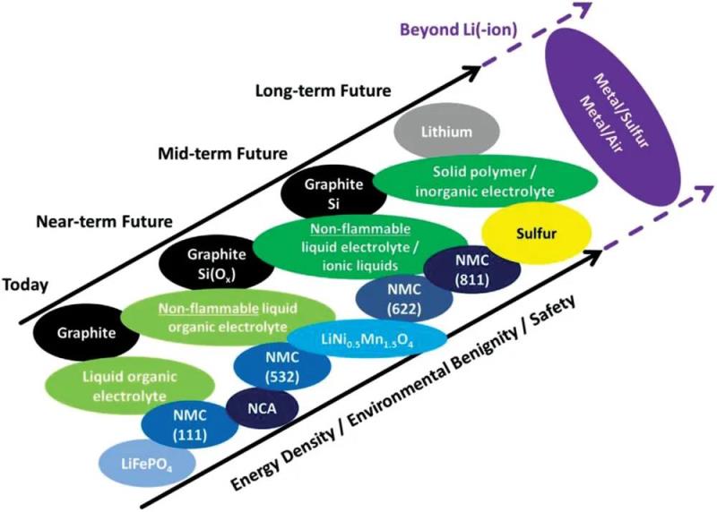 18世紀(jì),亞歷山德羅·沃爾塔(Alessandro Volta)首次建造了電池“堆”,由交替的陰極和陽極層組成,薄紙當(dāng)隔膜并由電解質(zhì)連接,構(gòu)成了現(xiàn)代電池的雛形。在19和20世紀(jì),一系列可充電(二次)和不可充電(一次)電池的開發(fā)層出不窮。其中,鉛酸電池是一個(gè)重大突破。直到今天,鉛酸電池仍占據(jù)電池市場的主要份額。20世紀(jì)下半葉,消費(fèi)類應(yīng)用對電池的需求增加,這些電池具有更長的運(yùn)行時(shí)間、更小的尺寸、更輕的重量、高安全性和低成本。自1960年代以來,人們開發(fā)了迄今為止最成功的電池:鋰電池。第一個(gè)鋰電池負(fù)極使用金屬鋰,但存在嚴(yán)重的枝晶問題。自1980年代后期以來,鋰金屬被石墨取代,石墨可以安全地脫插嵌鋰離子(即“鋰離子電池”)。但是,這種導(dǎo)致電池的能量密度顯著降低。第一個(gè)正極材料是層狀化合物TiS2,它的電位相對較低,且容量中等。而層狀過渡金屬氧化物(如CoO2)由于氧與鋰的相互作用更強(qiáng),且堆積密度更高,具有更高的電位和容量。第一個(gè)商用鋰離子電池于1990年代初由索尼公司制造并銷售。自進(jìn)入市場以來,鋰離子電池的能量密度提高了三到四倍,而價(jià)格卻下降了18倍。