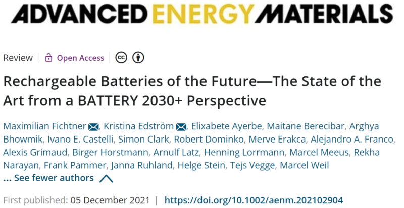 Maximilian Fichtner, KristinaEdstr?m, Elixabete Ayerbe, Maitane Berecibar, Arghya Bhowmik, IvanoE. Castelli, Simon Clark, Robert Dominko, Merve Erakca, Alejandro A.Franco, Alexis Grimaud, Birger Horstmann, Arnulf Latz, HenningLorrmann, Marcel Meeus, Rekha Narayan, Frank Pammer, Janna Ruhland,Helge Stein, Tejs Vegge, Marcel Weil. Rechargeable Batteries of theFuture—The State of the Art from a BATTERY 2030+ Perspective,Advanced Energy Materials.202102904