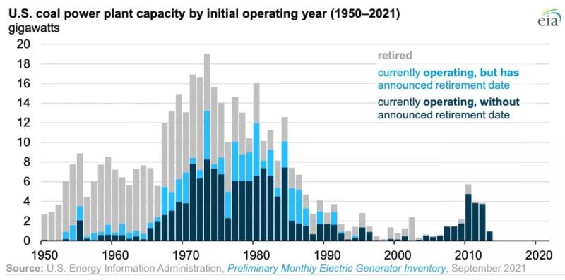 截至2021年9月,美國(guó)還有212吉瓦的公用事業(yè)規(guī)模燃煤發(fā)電廠在運(yùn)行,其中大部分是在20世紀(jì)70年代和80年代建成的。美國(guó)燃煤發(fā)電機(jī)組的平均運(yùn)行年限為45年。