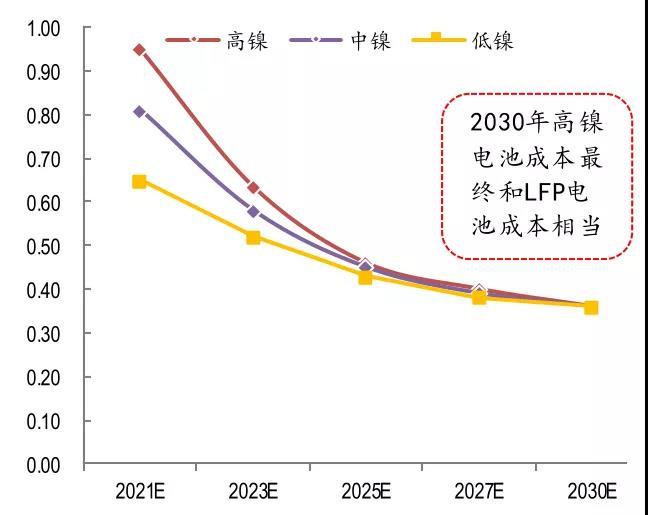 從長期看,三元高鎳和磷酸鐵鋰的成本差距會越來越小。根據(jù)財通證券的測算,預(yù)計2030年高鎳電池成本最終會和磷酸鐵鋰相當(dāng)。