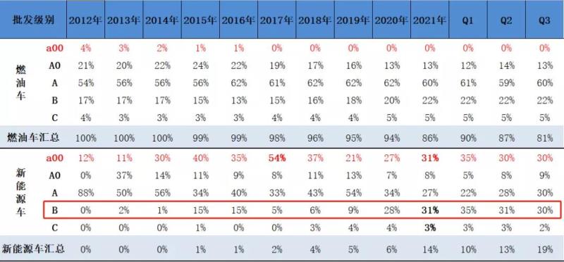 參照燃油車市場,A、B級車是主流,A00級別車型基本沒有市場。而在新能源市場,低續(xù)航的A00級別車型占比最高,但是其市占率正逐漸萎縮;反觀高續(xù)航B級電動車的滲透率正快速提升。