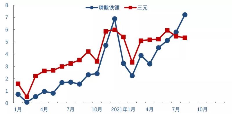 圖3:今年6月份以來磷酸鐵鋰的裝機量超過三元,資料來源:中國汽車動力電池產(chǎn)業(yè)創(chuàng)新聯(lián)盟,華創(chuàng)證券