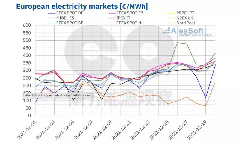 截至12月21日,法國(guó)、德國(guó)、荷蘭、比利時(shí)、瑞士、奧地利、斯洛文尼亞、克羅地亞、匈牙利、意大利和斯洛伐克的日前市場(chǎng)批發(fā)價(jià)格均超過(guò)400歐元/MWh。塞爾維亞、羅馬尼亞的價(jià)格分別為396歐元/MWh和395歐元/MWh。保加利亞和希臘處最低位342歐元/Mwh。