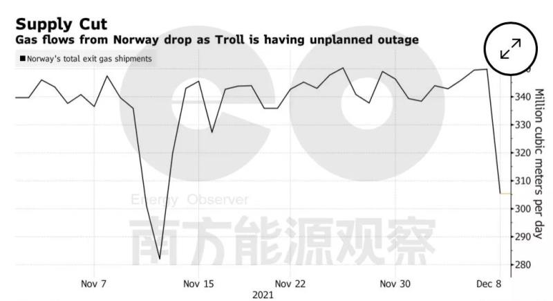 2021年夏季,挪威對(duì)油田和煉油廠進(jìn)行維修,天然氣產(chǎn)量一度下跌。隨著維修季的結(jié)束,挪威油氣生產(chǎn)從大規(guī)模生產(chǎn)限制中穩(wěn)步反彈,天然氣產(chǎn)量在10月上升至近3.5億立方米/天。但進(jìn)入11月,挪威主要的油氣田Troll油田再因故障限產(chǎn)。而俄羅斯和德國(guó)、烏克蘭之間復(fù)雜的地緣政治,也使得北溪2號(hào)管道投入使用問(wèn)題不明朗,進(jìn)而引發(fā)俄羅斯對(duì)歐洲減供。德國(guó)天然氣管道運(yùn)營(yíng)商Gascade的數(shù)據(jù)顯示,自12月18日以來(lái),俄羅斯向德國(guó)輸送天然氣的“亞馬爾-歐洲管道”一路下跌,直至12月21日斷供。