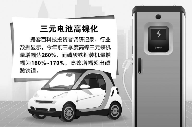此前,我國三元電池以NCM523為代表的5系中鎳為主,但近年來,高鎳在三元材料中的滲透率不斷提升。據(jù)鑫欏資訊數(shù)據(jù),今年7月國內(nèi)高鎳材料產(chǎn)量達到13820噸,占三元總產(chǎn)量的41.6%,首次超越主流5系材料,順利登頂。隨后幾個月,高鎳三元材料市占率一直維持高位,其中8系市占率穩(wěn)定在40%以上。據(jù)容百科技(688005)投資者調(diào)研記錄,行業(yè)數(shù)據(jù)顯示,今年前三季度高鎳三元裝機量增幅達260%,而磷酸鐵鋰裝機量增幅為160%~170%,高鎳增幅超出磷酸鐵鋰。當升科技(300073)亦表示,公司高鎳8系產(chǎn)品在總銷量中的占比正在快速提升,主要出口海外和供應給車企客戶。