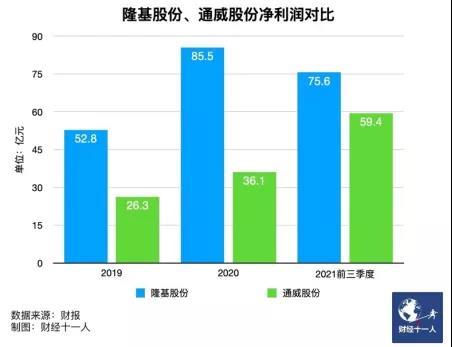 如果說(shuō)隆基是因?yàn)樽プ×藛尉У某~利潤(rùn)才成為光伏老大,那么通威股份(600438.SH)眼下也趕上了硅料的超額利潤(rùn)期,盡管持續(xù)時(shí)間可能并不長(zhǎng)。2021年,得益于硅料的高價(jià),通威迅速拉近與隆基的凈利潤(rùn)差距。2022年硅料價(jià)格依然較高,通威作為龍頭獲利最大,而隆基的硅片利潤(rùn)進(jìn)一步收縮,通威有可能超越隆基,成為最賺錢(qián)的光伏公司。