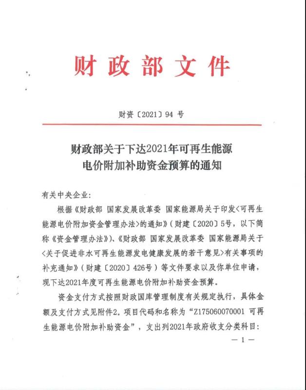 附件:《財(cái)政部關(guān)于下達(dá)2021年可再生能源電價(jià)附加補(bǔ)助資金預(yù)算的通知》(財(cái)資〔2021〕94號(hào))