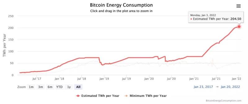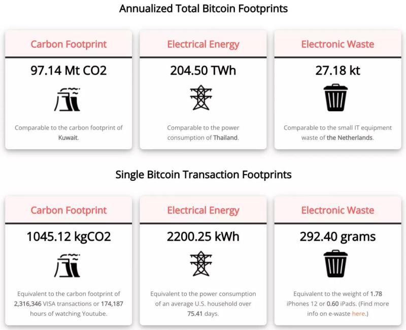 中國儲能網(wǎng)訊:根據(jù)https://digiconomist.net/網(wǎng)站的統(tǒng)計,2021年全年比特幣的碳足跡、耗電量、電子垃圾如下:
