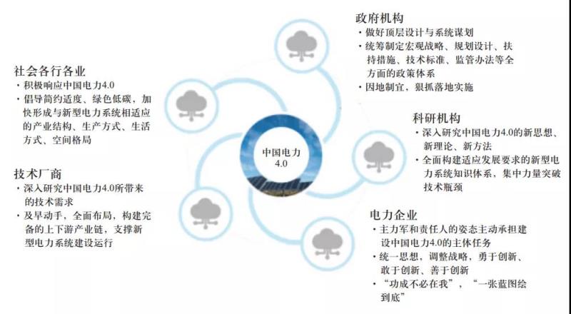 要實現(xiàn)中國電力4.0,需要政府、科研機構(gòu)、電力企業(yè)、技術(shù)廠商以及社會各行各業(yè)的共同努力(見圖4),共同攜手銳意進取。