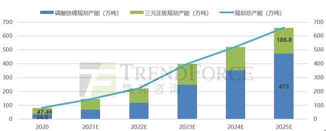 Trendforce集邦咨詢預(yù)計(jì)至2025年全球動(dòng)力鋰電池對(duì)正極材料需求將突破215萬噸,若加上儲(chǔ)能、消費(fèi)電子等領(lǐng)域,正極材料需求或?qū)⒊^360萬噸。而單單是國(guó)內(nèi)磷酸鐵鋰的規(guī)劃總產(chǎn)能至2025年便超過了500萬噸,還不包括三元正極,這背后的產(chǎn)能過?!跋葳濉毙枰?。