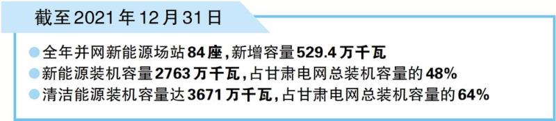 中國儲能網(wǎng)訊:截至2021年12月31日,甘肅電網(wǎng)全年并網(wǎng)新能源場站84座,新增容量529.4萬千瓦,同比增長24%,刷新了國網(wǎng)甘肅省電力公司年度新能源投產(chǎn)歷史紀錄,其中新增風電368.7萬千瓦(45座風力發(fā)電廠)、光伏160.7萬千瓦(39座光伏電站)。甘肅電網(wǎng)新能源裝機容量達2763萬千瓦,占全網(wǎng)總裝機容量的48%,清潔能源裝機容量達3671萬千瓦,占全網(wǎng)總裝機容量的64%。