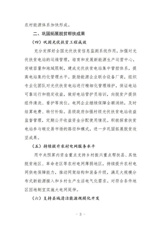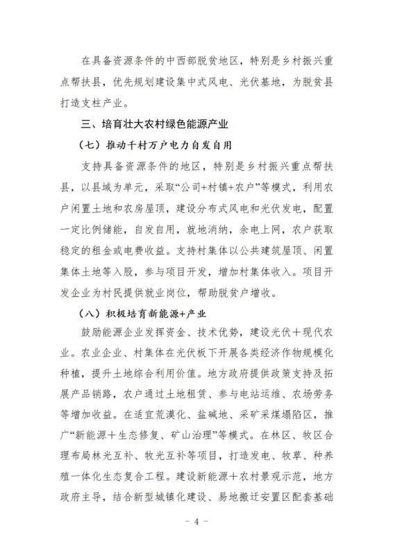 推動(dòng)千村萬(wàn)戶電力自發(fā)自用。支持具備資源條件的地區(qū),特別是鄉(xiāng)村振興重點(diǎn)幫扶縣,以縣域?yàn)閱卧扇 肮?村鎮(zhèn)+農(nóng)戶”等模式,利用農(nóng)戶閑置土地和農(nóng)房屋頂,建設(shè)分布式風(fēng)電和光伏發(fā)電,配置一定比例儲(chǔ)能,自發(fā)自用,就地消納,余電上網(wǎng),農(nóng)戶獲取穩(wěn)定的租金或電費(fèi)收益。支持村集體以公共建筑屋頂、閑置集體土地等入股,參與項(xiàng)目開(kāi)發(fā),增加村集體收入。項(xiàng)目開(kāi)發(fā)企業(yè)為村民提供就業(yè)崗位,幫助脫貧戶增收。