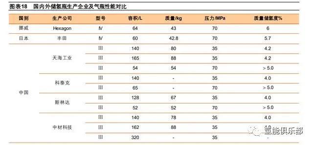 從國內(nèi)主要高壓儲氫瓶生產(chǎn)企業(yè)生產(chǎn)的III型儲氫瓶與國外IV型瓶性能對比來看,IV型瓶質(zhì)量輕且儲氫密度高。同等體積下, 壓力越大儲氫量越高,車輛行駛里程就更遠。根據(jù)《汽車產(chǎn)業(yè)中長期發(fā)展規(guī)劃》,短期內(nèi)國內(nèi)儲氫技術(shù)仍然會以高壓儲氫為 主。