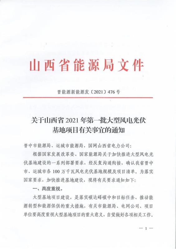 中國(guó)儲(chǔ)能網(wǎng)訊:近日,山西省能源局發(fā)布《關(guān)于山西省2021年第一批大型風(fēng)電光伏基地項(xiàng)目有關(guān)事宜的通知》,確認(rèn)了晉中市、運(yùn)城市各100萬(wàn)千瓦風(fēng)電光伏基地規(guī)模及項(xiàng)目清單。