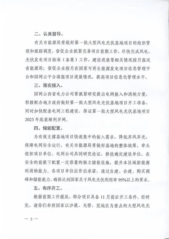 通知要求:國(guó)網(wǎng)山西省電力公司要抓緊研究提出電網(wǎng)接入和消納方案, 積極配合地方政府做好第一批大型風(fēng)電光伏基地項(xiàng)目開(kāi)工準(zhǔn)備,同時(shí)加快配套電網(wǎng)工程建設(shè),保證第一批大型風(fēng)電光伏基地項(xiàng)目 2023年底前順利并網(wǎng)。
