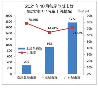 2021年10月,全國上線氫燃料電池車5025輛。其中,京津冀、上海、廣東3個城市群共上線氫燃料電池車2990輛,占比為59.5%。具體來看,廣東城市群上線車輛為1772輛,大大高于京津冀城市群和上海城市群的總和,后兩者上線的氫燃料電池車數(shù)量分別為295輛和923輛。