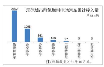 根據(jù)聯(lián)盟的統(tǒng)計數(shù)據(jù),截止到2021年10月底,新能源汽車國家監(jiān)測與管理平臺累計接入全國氫燃料電池汽車6910輛。其中,三大示范城市群累計接入4283輛,占比61.98%。從示范城市群推廣的燃料電池車輛來看,物流特種車和公交客車所占比重較高。其中,物流特種車累計接入2602輛,占比達到60.75%;公交客車累計接入1095輛,占比為25.57%;兩者合計占比超過八成。另外,公路客車累計接入361輛,占比8.43%;通勤客車累計接入160輛,占比3.74%。至于工程特種車、環(huán)衛(wèi)特種車、租賃乘用車等,則相對較少。這種結構的形成主要是由于氫燃料電池車還處于示范應用推廣階段,受限于加氫站分布、成本等因素,目前示范運營車輛集中在商用車領域,尤其是物流車和公交車。