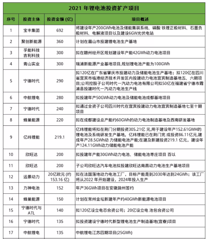 據(jù)不完全統(tǒng)計,2021年各個鋰電池企業(yè)投資擴產(chǎn)項目多達(dá)82個,投資金額累計超6700億元,新增裝機規(guī)模超1240GWh。