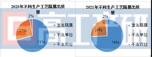 從隔膜產(chǎn)品結(jié)構(gòu)來看,2021年中國鋰電隔膜市場出貨仍以濕法隔膜為主,市場占比74%。濕法隔膜市場占比提升的原因為:1)下游對性能要求逐步提升,濕法隔膜厚度更薄,可提高鋰電池能量密度;2)下游需求旺盛,行業(yè)供求偏緊,濕法隔膜產(chǎn)能投放大于干法隔膜,推動濕法隔膜出貨量。2021年干法占比雖有所減少,但其出貨量保持快速增長,主要受儲能、小動力電池增長帶動。