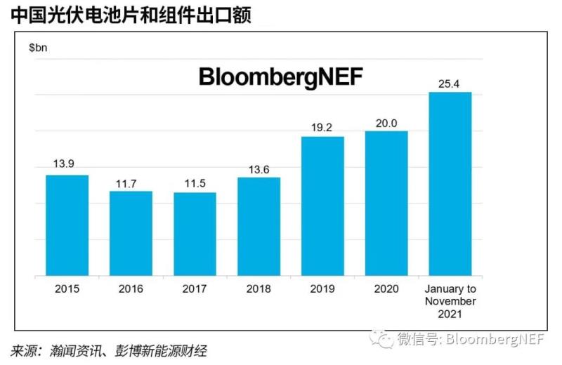 中國儲能網訊:中國光伏行業(yè)出口額在2021年11月仍然處于高位,盡管光伏組件現(xiàn)貨價格上漲可能已經抑制需求。這一數據推動2021年1月至11月的出口額達到254億美元,假設平均價格為每瓦23.3美分,上述出口量約合109GW。如果再加上另外約16GW的薄膜組件和東南亞產量,這一出口數據支持了彭博新能源財經此前對2021年新增光伏裝機容量達到至少183GW的預期。