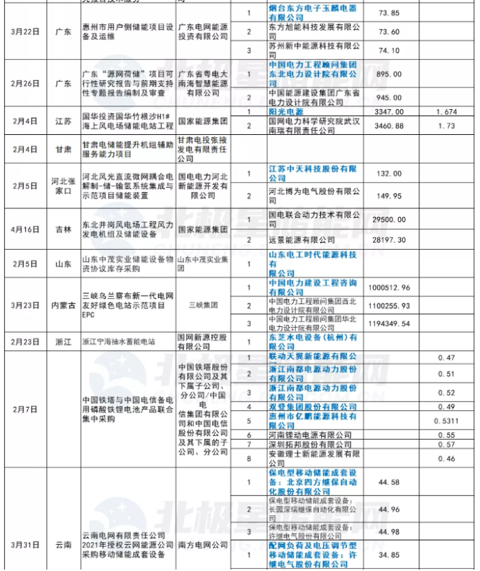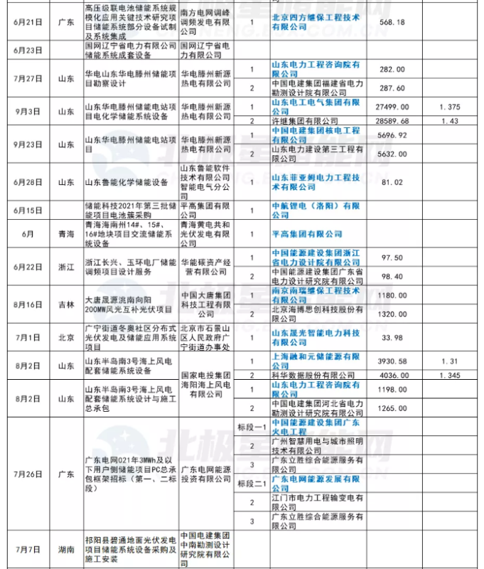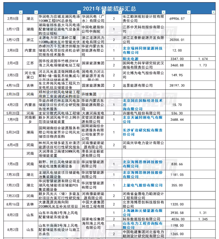 在各地新能源項目開發(fā)方案中都提出配置儲能要求的支撐下,儲能市場需求正極速擴(kuò)張。國家電網(wǎng)、南方電網(wǎng)、國家電投、華能、華電、華潤、三峽集團(tuán)等等眾多央企國企陸續(xù)發(fā)布儲能項目設(shè)備或儲能研究招標(biāo)。