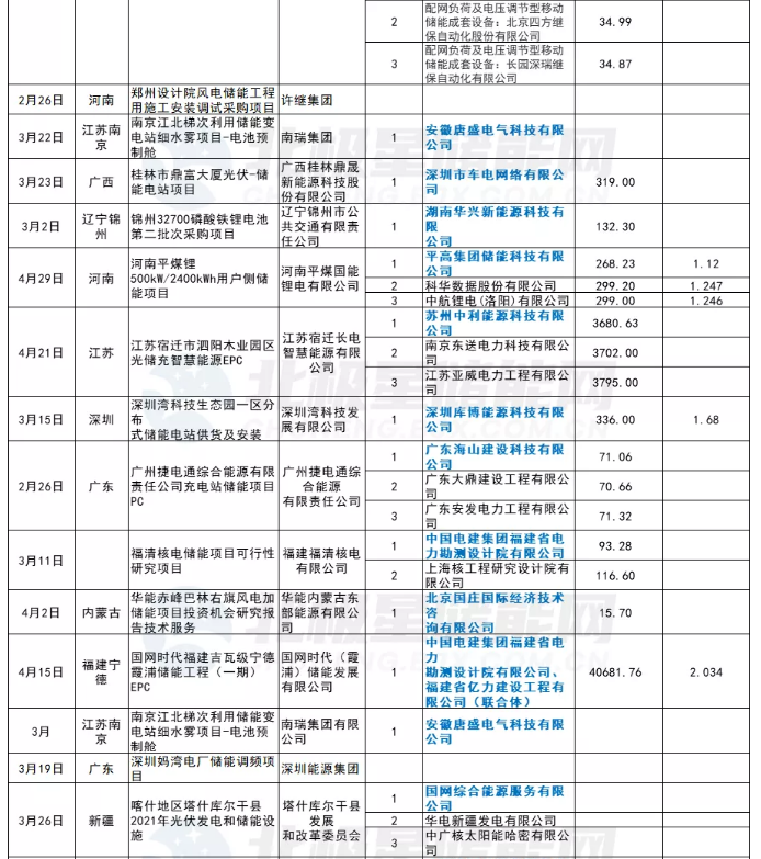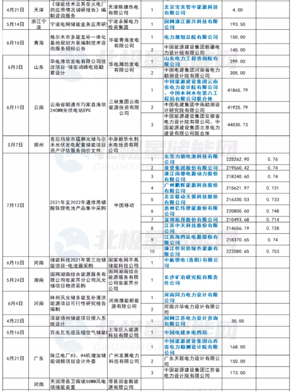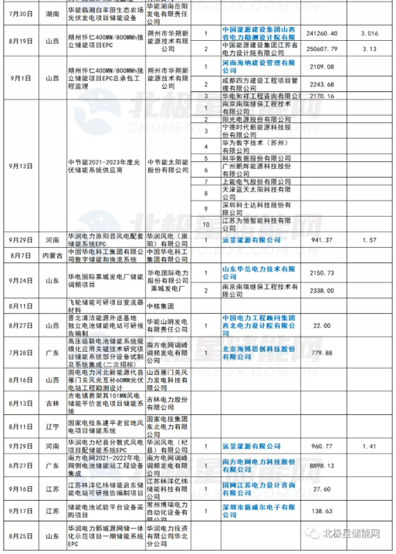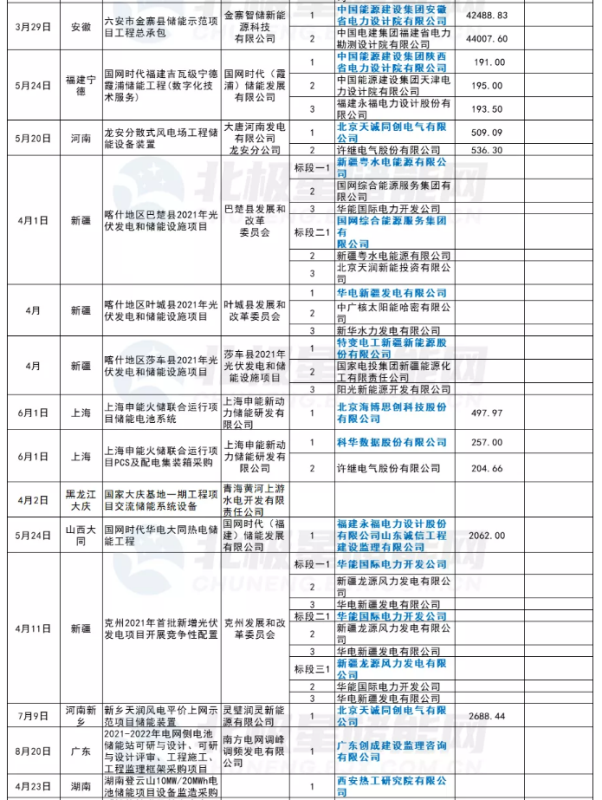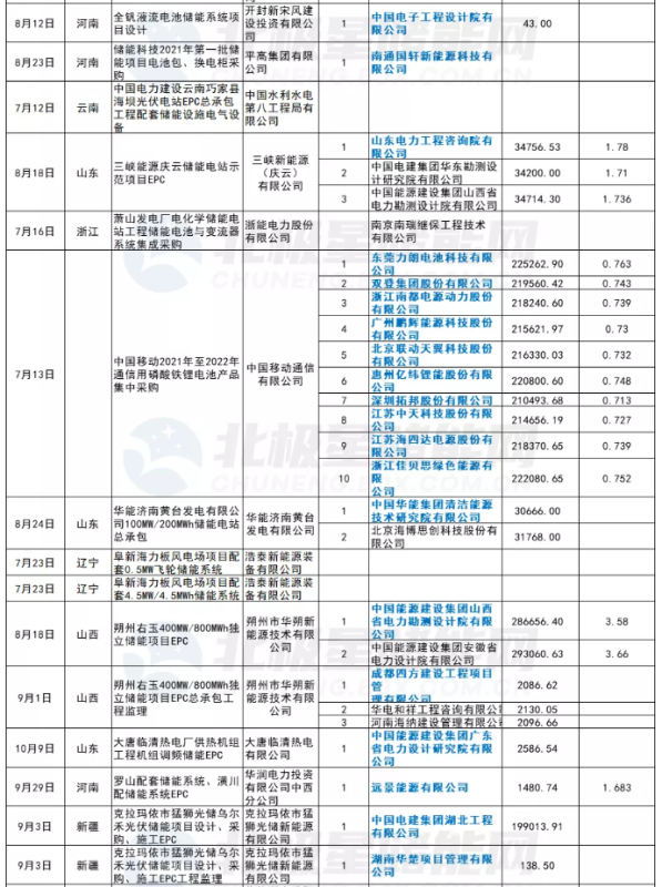 在新能源配套儲能項目中,最有看點(diǎn)的是中核匯能有限公司2021-2022年新能源項目配套儲能系統(tǒng)招標(biāo),共有南瑞繼保、上能電氣、陽光電源、科華數(shù)據(jù)、遠(yuǎn)景能源、智光儲能、欣旺達(dá)、上海采日、山東電工電氣、許繼電氣、東方日升、科士達(dá)、平高集團(tuán)、神州數(shù)碼等24家企業(yè)參與投標(biāo)。其中最高報價為中國電力工程顧問集團(tuán)西北電力設(shè)計院有限公司的44780萬,儲能單價2.17元/Wh,最低報價為中國電建集團(tuán)華東勘測設(shè)計研究院有限公司的38759.53萬,儲能單價1.88元/Wh,最終神州數(shù)碼、遠(yuǎn)景能源、上能電氣、平高集團(tuán)獲得中標(biāo)。